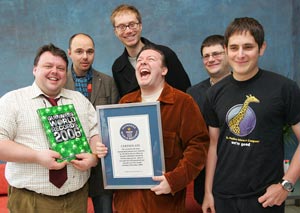 Left to right: Craig Glenday (GWR), Karl Pilkington, Stephen Merchant, Ricky Gervais, Jake Jellinek (Positive Internet), Nick Mailer (Positive Internet).